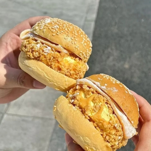 Burger ice cream offers a fun and surprising dessert experience with its realistic burger design. Featuring a golden brown bun appearance and layered ice cream details, this treat combines playful visuals with smooth vanilla flavor for a unique indulgence.